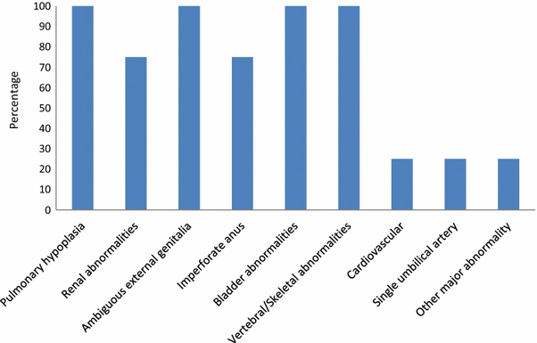 Chart depicting the frequency of occurrence of other system abnormalities in association with hydrometrocolpos in an autopsy series of four cases at a tertiary referral center between 2009 and 2014