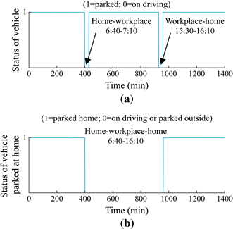 In the integration study of EVs, the charging or discharging availability is also very important. The EV availability describes the available time slot when they are parked and can be charged or discharged during the day. With different EV charging and discharging possibility assumptions, two types of EV availabilities are studied in this paper, including EV availability all day and EV availability at home. The EV availability all day refers to the situation that EVs can be charged or discharged in a day whenever they are parked. EV availability at home refers to the situation that EVs can only be charged or discharged when they are parked at home.
