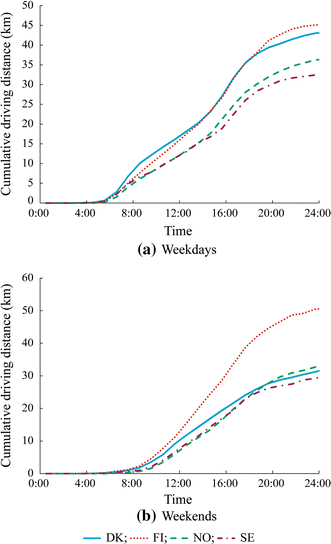 It is shown that people drive more often on weekdays than on weekends in Denmark as the vehicles are mainly for daily commuting purpose between home and workplace. The driving activities are more active in Finland than the other three countries, especially on weekends. Norway and Sweden show moderate driving distances on both weekdays and weekends. The daily driving distance will not only have important impacts on EV battery sizing but also EV charging energy planning to the power system. The higher driving distance in Finland will possibly lead to higher pressure for energy planning of EV charging. However, the generally low daily driving distance is conducive to the EV promotion and EV integration to the power system in Nordic region.