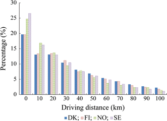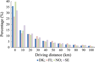 About 64% of the vehicles in Denmark and 65% of the vehicles in Finland have a driving distance less than 40 km per day. The percentages in Norway and Sweden are about 73% and 74%, respectively.