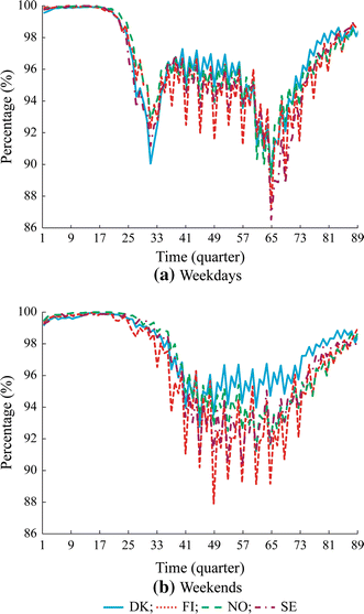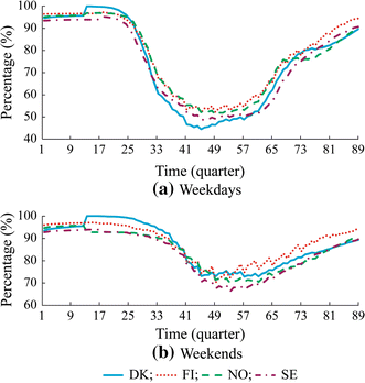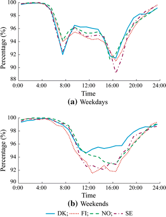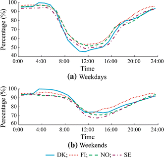 The EV availabilities all day in all the four Nordic countries have similar patterns. On weekdays, there are two obvious valleys in curves of EV availability all day, one in the morning at about 8:00 and the other one in the afternoon during 16:00 to 17:00. Such characteristic is consistent with the traffic hours when people go to work in the morning and come home from work in the afternoon. On weekends, the curves of EV availability all day are smoother. The EV availabilities start to drop gradually in the morning and climb up steadily in the evening. Different from the case on weekdays, the EV availabilities do not increase again in the morning and stay on a plateau in the middle of the day on weekends. Such difference is because that there are very few driving behaviors for work on weekends. Therefore, the W-shape curves which are closely related to the driving and parking behaviors for work commutes on weekdays does not show up on weekends.