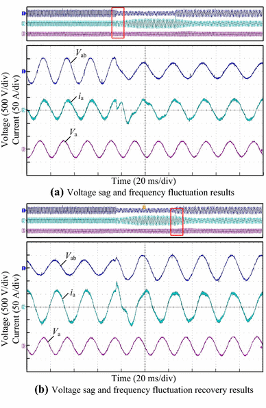 Voltage-disturbance ride through of the PET with a three-phase 60% balance voltage sag, a frequency variation of 50/40 Hz, and a phase jump