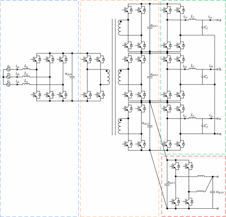 In Fig. 1, the proposed PET topology has an inner high-voltage (u dc = 1050 VDC) bus and a low-voltage (udcL1,2,3 = 350 VDC) bus (a u dc voltage command could be set by operators, e.g., u dc = 1200 VDC). Thus, voltage and load-disturbance isolation would be possible with the help of DC link buffer capacitors. Further efforts should focus on the key control strategies, especially the front-end rectifier.