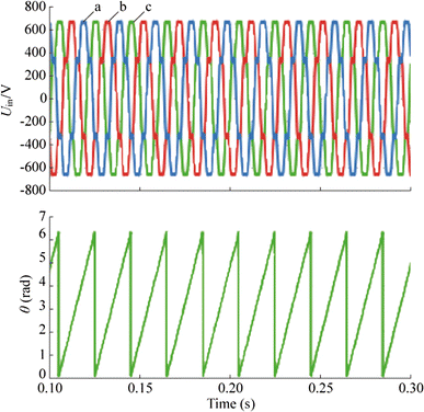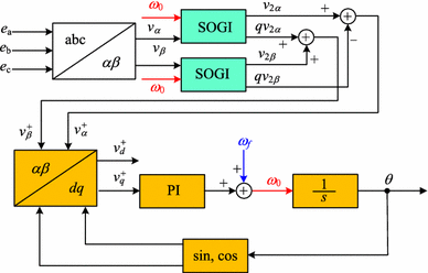 In addition, the PLL output frequency is fed back to the SOGI part, as shown in Figs. 3 and 4. Equations (1) and (2) indicate that no matter how ω0 changes, the bandwidth of the filter is only determined by the given coefficient k. Therefore, it is an adaptive PLL that is theoretically not affected by the variation in the line frequency.
