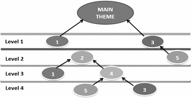 The conversation tree has four levels, the main theme is in the root and reactions are situated on levels 1–4, and all reactions of the same discussant have the same tint of the gray color