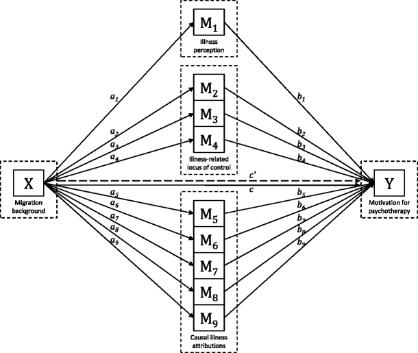 Multiple-mediation model for the influence of migration background on motivation for psychotherapy mediated by illness beliefs, tested on the basis of Preacher and Hayes [60]. X independent variable, migration background; M 1 –M 9 proposed mediators; M 1 illness perception; M 2 internal locus of control; M 3 social–external locus of control; M 4 fatalistic–external locus of control; M 5 psychological illness attribution; M 6 stress-related illness attribution; M 7 biological illness attribution; M 8 fatalistic illness attribution; M 9 supernatural illness attribution; Y dependent variable, motivation for psychotherapy