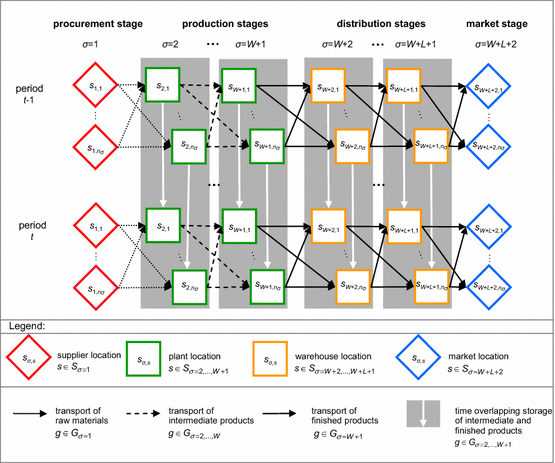 The supply chain controlled by the institutional investor includes several locations, which can be assigned to different supply chain stages. The number of supply chain stages is to be set according to the specific process interdependencies. Raw materials of different kinds can be obtained from external suppliers used in the procurement stage. A transformation process into intermediate and finished products is conducted in plant locations, which are located in W subsequent production stages. Finished products are distributed by warehouse locations in L subsequent distribution stages to meet the demand in the market stage. Production and distribution stages are separated to depict different activities (i.e., transformation and storage processes) and ingoing product states (i.e., raw materials, intermediate and finished products). The planning horizon determined by the investor’s engagement is divided into time periods of 1 year each. Assuming an appropriate data aggregation, the simultaneous supply chain planning dominates successive approaches. However, as the simultaneous planning of all supply chain tasks is considered to be impracticable, short-term continuous-time models for production, distribution and scheduling (for example Steinrücke 2011, 2015) should be applied additionally after solving our proposed discrete-time model.