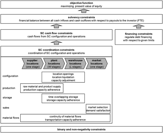 In order to depict the financial leeway of a company, several models include budgets that are considered in isolation and must be managed so as to ensure that they are not exceeded. For example, Kouvelis and Rosenblatt (2002) develop a quantitative model for global supply chains and maximize the net present value (NPV) of cash flows, i.e., before-tax income, interest payments, depreciation expenses, loan payments and corporate income taxes. A discounting rate for each country and period is given. They distinguish between investments in distribution centers and subassembly plants. For financing, budget restrictions provide loans granted by the government. There are country-specific per-period interest rates on the loans. Moreover, cash expenditures in fixed assets that are not financed by external sources are included. Wilhelm et al. (2005) optimize the strategic design of an assembly system in an international business environment. The objective is to maximize the total after-tax profit, while facilities (including locations, technologies and capacities) are chosen, suppliers are selected, distribution centers are located, and transportation modes are planned. The model contains a budget limitation assuring that total fixed costs associated with prescribing facilities and transportation modes for specific end products do not exceed a given amount of money. Chakravarty (2005) propose a model for optimizing plant investment decisions. In this context, they decide on where and how much to invest, what quantities to produce, which products to absorb the investment overhead, what product amounts to export and how to price the products. The considered company maximizes its profits over the planning horizon. The author assumes that the company has a fixed sum available for investment in plants at the beginning of the planning horizon. Fleischmann et al. (2006) develop a strategic planning model to optimize the global production network of an automobile manufacturer. In particular, they consider the allocation of products to production sites over a 12-year planning horizon. The financial impact of physical investments on the cash flows is taken into account in an extended model with an objective function that minimizes the NPV of costs and investment expenditures. Due to the company’s self-financing strategy, yearly investment budgets that are estimated for the whole planning horizon by the yearly cash flows are used.