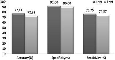 - (e)To estimate the overall performance of MLPNN and kNN classifiers, statistical measures (accuracy, specificity, sensitivity) were averaged. The comparison of averaged values for classification of emotions is shown in Fig. 10. As shown in the figure, the performance of MLPNN was higher than that of kNN. However, both methods can be accepted as successful.Fig. 10
