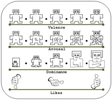 Assessment: SAM employed for valence, arousal, dominance, likes, and familiarity.