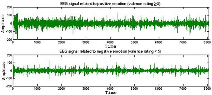 Sample EEG signals related to positive and negative emotions. Sample EEG signals were measured from channel Fp1. Time axis was defined as second; amplitude axis was defined as µV