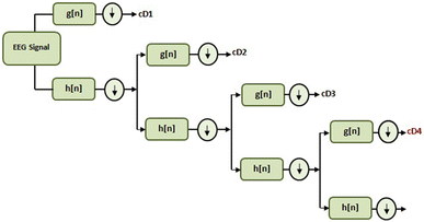 In literature, EEG theta band dynamics including important information about emotions can be seen [24, 26, 27]. Therefore, theta band dynamics were used in order to obtain feature vectors. Selection of suitable mother wavelet and the number of decomposition levels is very important to analyze non-stationary signals [10]. In this study, the number of decomposition levels was chosen as 4 because theta band dynamics of EEG signals were considered to recognize different emotions based on audiovisual stimulus. Dabuechies wavelets have provided useful results in analyzing EEG signals [10], and hence Daubechies wavelet of order 2 (db2) was chosen in this study.