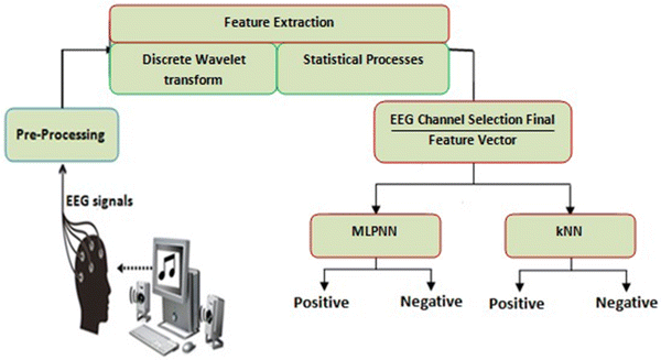 Murugappan et al. [18] classified five emotions based on EEG signals. They used EEG signals that recorded from 64, 24, and 8 EEG channels, respectively. They achieved maximum classification accuracy of 83.26 and 75.21% using kNN and linear discriminant analysis (LDA) algorithm, respectively. Researchers employed DWT method for decomposing the EEG signal into alpha, beta, and gamma bands. These frequency bands were analyzed for feature extraction.