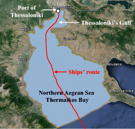Thermaikos bay and ship route to and from the port of Thessaloniki