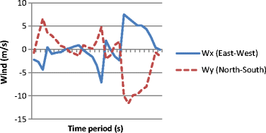 After a thorough consideration, the period of data selected to be used from the POSEIDON dataset was a winter week of January (21-28/01/2014) which exhibited significant winds (Fig. 3), able to transport the oil slick and produce substantial results. The data were given for 29 time steps (6 h each). The POSEIDON dataset for the Aegean sea offers 3D hydrodynamic forecasts (POM) nested to POSEIDON Med forecast, for the depth levels of 5, 15, 30, 50, 80 and 120 m. The depth in the area under study, as shown in Fig. 2, is less than 100 m.