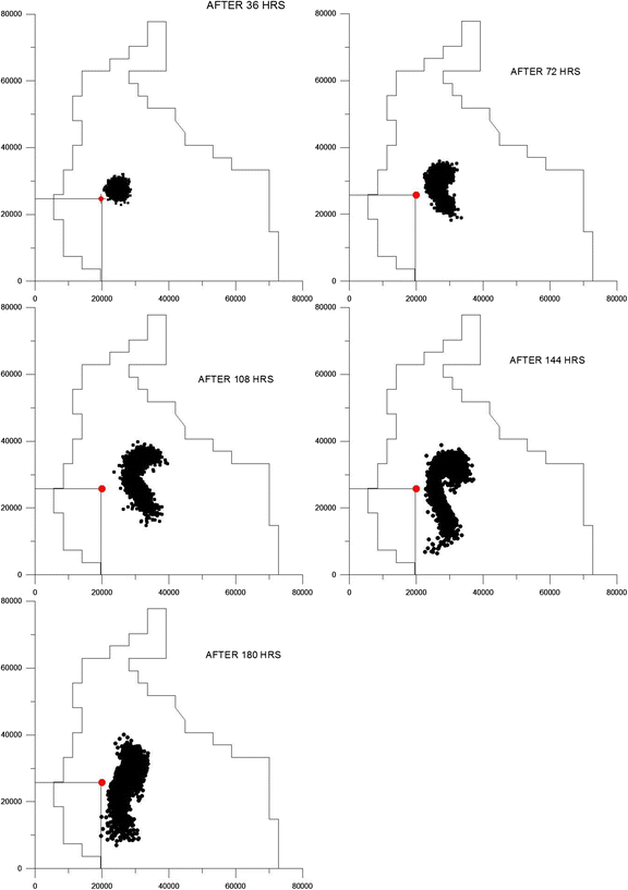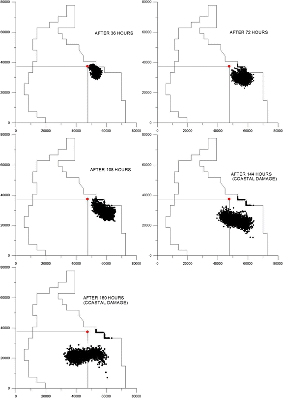 Figure 5 depicts more clearly the transport of the oil spill and its statistical center of gravity, as it is advected for many kilometers in Thermaikos Bay. The model results show that a contingency emergency plan should be, in this case, activated in less than 36 h, in order to contain the plume and prevent the ecologic damage. In the case of the oil spread near the coast of Chalkidiki (Fig. 6) measures should be taken much faster in order to avoid the coastal damage and consequently the social, economic and environmental damage of the area.