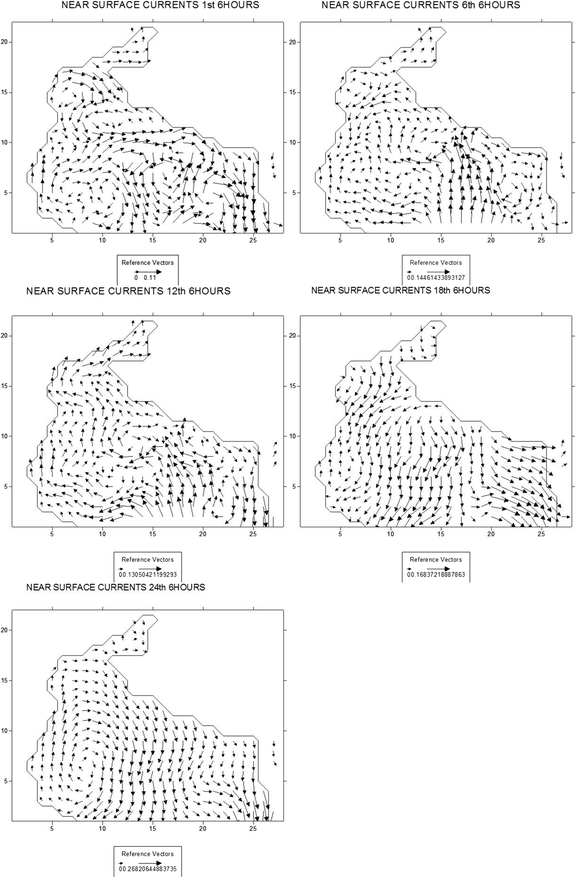 Based on all that, new horizontal positions of the oil ‘particles’ are estimated; some are ‘trapped’ on the beach, others may be vertically displaced due to buoyancy and diffusion; a fraction of heavy classes of oil may be emulsified over a certain wave curvature, whereas a light oil fraction in sea or on coast may be evaporated. All these are better described in the next paragraph.