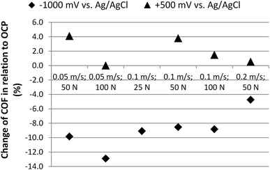 The influence of electrochemical potentials on the COF also strongly depends on the tribological test parameters. At low sliding speeds a higher change of COF was observed. This is an indication for the enhancement of hydrodynamic lubrication, which are assumed to arise due to the formation of an electric double layer (increase of repulsion force, increase of surface near viscosity).