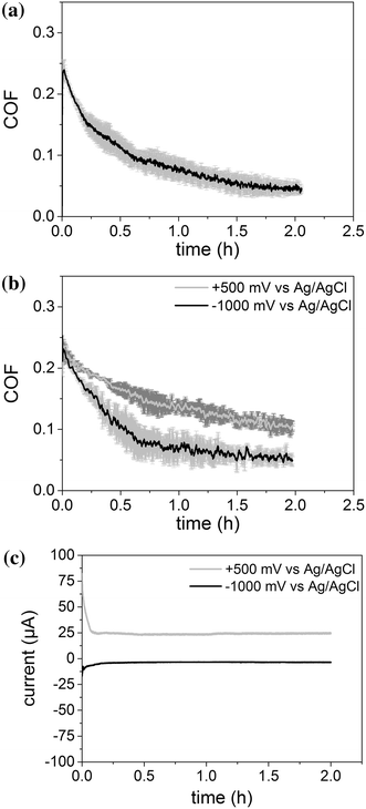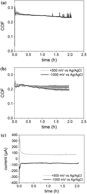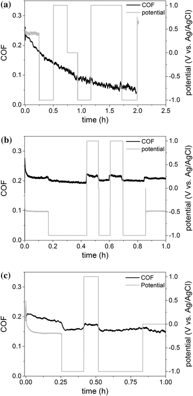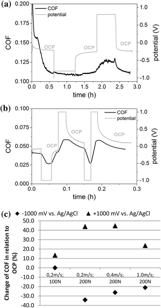 Coefficient of friction at a constant electrochemical potential using pin-on-disk geometry (SiSiC; 1 M NaCl, 50 N; 0.1 m/s, 2 h): a test at OCP without external potential; b test at cathodic and anodic potentials; c current measured during friction test at cathodic and anodic potential