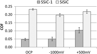 Friction tests with at different electrochemical potentials were started at OCP, afterward the potential was changed as shown in Fig. 12a, b. The friction values of SSiC-3 at OCP (SSiC) show that the friction coefficient reached constant value of 0.11 after a 30 min running-in period. In contrast to the subsequent cathodic polarization with nearly no change in COF, there is a strong COF change at anodic potential (Fig. 12a). This increase of the COF is reversible because after switching the potential to OCP the COF decreases to its starting level after running-in.