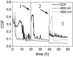 Results of friction tests using ring-on-disk geometry (1 M NaCl; 100 N; 0.2 m/s): COF of SSiC-3 at three successive 20 h friction tests at a constant electrochemical potential
