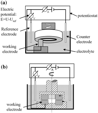 Three electrode test setup for electrotribological measurements (WE: testing sample, RE: Ag/AgCl, CE: platinum): a pin-on-disk geometry; b ring-on-disk geometry