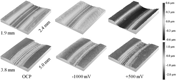 Analysis of the wear scar of the disk after pin-on-disk test with constant electrochemical potential using white light interferometry (1 M NaCl, 50 N; 0.1 m/s; 2 h): (above) SSiC-1; (below) SiSiC