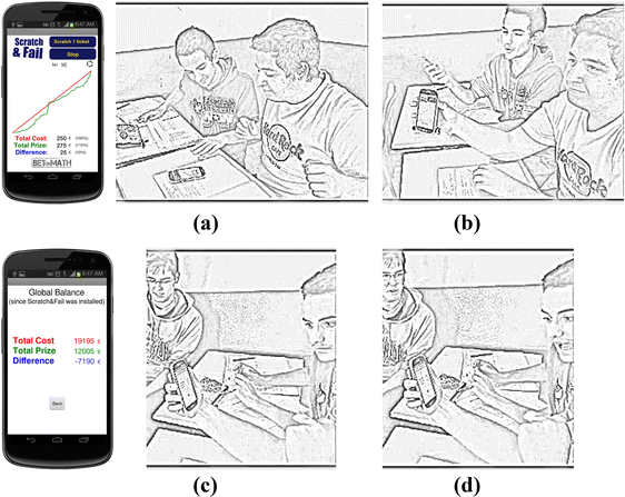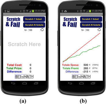 Since the students tend only to notice and remember the times they win, the simulator has a “secret button”, which opens another page that reveals the total amount of money that the students have paid, the amount they have earned (with prizes), and the (negative) difference between earned money and amount paid (Fig. 5c–d) ever since when the app has been installed on the smartphone. At this point of the activity, the teacher clicks on this button and the new page tells a completely different story: a (true) story of losers, not an (illusory) story of winners!