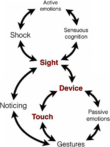 Technology (as embodied in this Android app), touch, sight, emotion and cognition are indeed the keywords of this research. Not only this: they are also strictly interrelated with the experience of shock. Shock is emotionally as well as cognitively charged; it is triggered by perception and changes behaviour. The diagram in Fig. 6 represents an attempt to summarise the main ideas that have emerged in our work to date: the device activates perception, but if sight plays the sole role of seeing where the finger should go, then the students live passive emotional reactions that very well resemble the ones experienced by actual gamblers. Even when sight allows the students’ sensibility to notice, it is difficult for the learners to leave the game. It is only through a shock that the students have a chance to become active thinkers. It is on this occasion that sensuous cognition exploits its full potential.