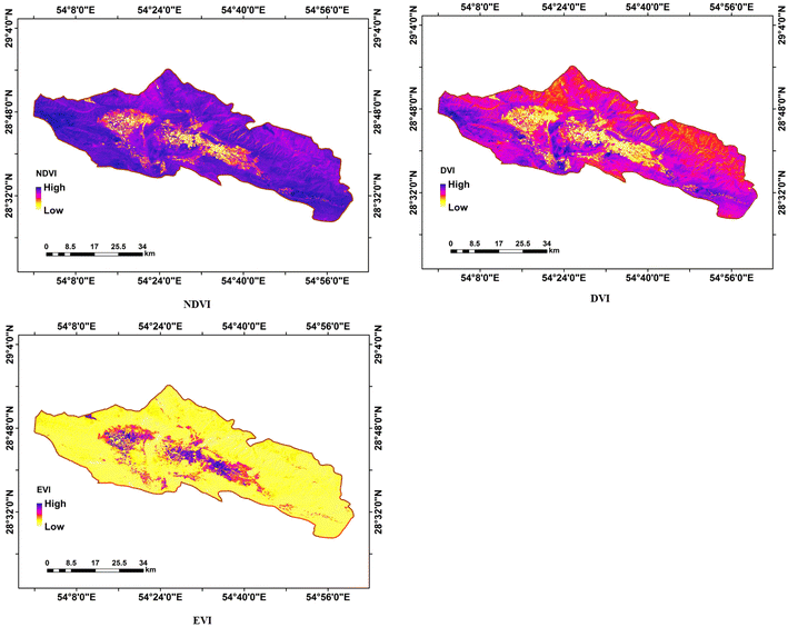 Based on the results obtained by analyzing the vegetation indices, it was found that vegetation growth and vegetation indices increase with increasing elevation and aspect. The vegetation growth is highest between the elevations of 1500 to 3000 m, with the NDVI, EVI and DVI values being large. In addition, the best vegetation in this zone is distributed towards NW 300°.