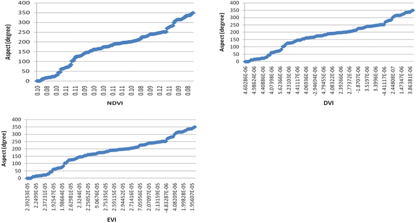 The change of the vegetation indices values with aspect in the study area