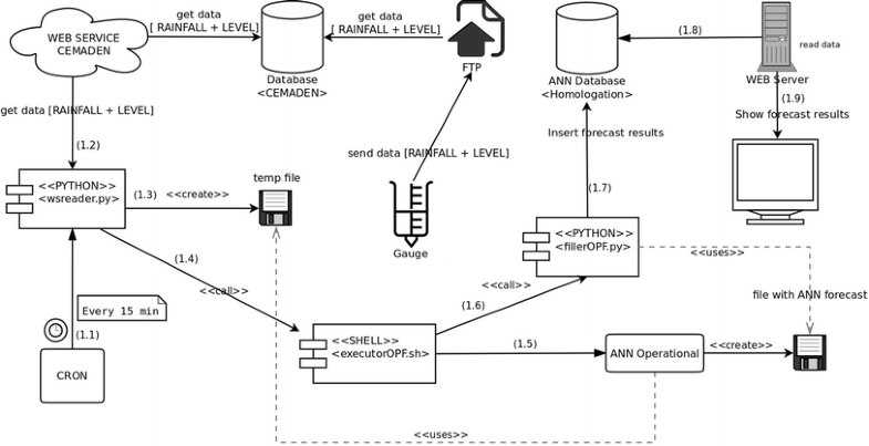Python script invokes a shell script (branch 1.4 in Fig. 2) that, via a system call trigger the ANN. The ANN will predict river level at target station (watershed outlet) for the future time scheduled in the entrance of the CRON (branches 1.4 and 1.5 in Fig. 2).
