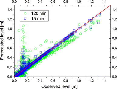Scatter plot between observed and neural-forecasted level values for prediction horizons of 15 and 120 min