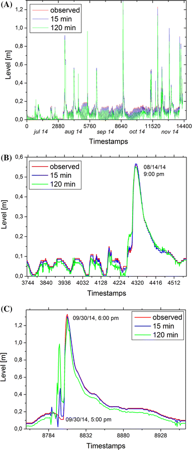 Figure 3a compares the observed level values with 15 and 120 min neuro-forecasting results, for all instances in the test sets while Figs. 3b, c highlights two different moments when rainfall occurred in the watershed and the river’s level rose from low values, between 0 and 0.1 meters, and quickly reached local peaks. Regarding the major peaks in Figs. 3b, c, the agreement between observed and forecast values is very good for both 15 and 120 min models. However, it may be noted that, preceding the major peaks, the neuro-forecasting results present short-term fluctuations (in the form of minor peaks) that not exist in the observed values. This mismatch (most evident in Fig. 3c) is greater for the 120 min model. The causes of this anomalous behavior will be investigated in order to refine the model. Even so, we still emphasize that in an early warning scenario more important than small and punctual mismatches is the accuracy of proposed neuro-forecasting models into monitor the dynamic behavior of river level pointing out sudden increases.