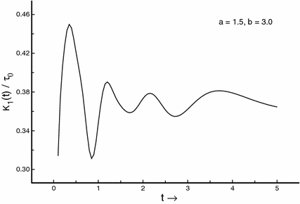 Stress intensity factor (\(K_{1}(t)/\tau _{0}\)) against time t (\(a=1.5,~b=3.0\))