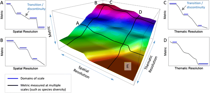 Panels a–d describe a common conceptualisation of the scale continuum in landscape ecology based on the relationship between scale (in this case spatial or thematic resolution) on the x–axis and ecological metric values on the y-axis such as population viability, abundance and species richness. Scale (a–d) is conceptualised as having a number of domains identified by segments along the scale continuum (blue lines) at which the metric of interest is relatively constant. Commonly multi-scale analyses only consider a single aspect of scale (e.g. spatial or thematic resolution) at a time. In panel (e) we have represented the interaction of different aspects of scale as a two-dimensional surface where black lines across the surface represent analyses based on a single scale dimension (a, b, c, d)