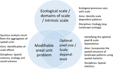 Three different kinds of treatment of scale and the corresponding methods employed in landscape ecology that originate from a number of different disciplines, with a range of objectives. The bottom two circles in the Venn diagram are purposefully positioned closer together to reflect the fact that they represent very similar concepts and are often treated in the same way. Future solutions to scale may lie in integrating these different methods and concepts