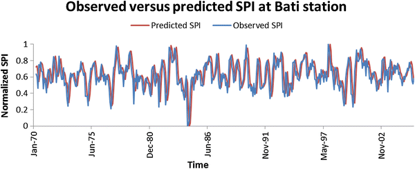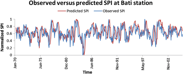 SPI 3 forecast results for the best WA-ANN model at the Bati station for 1 month lead time