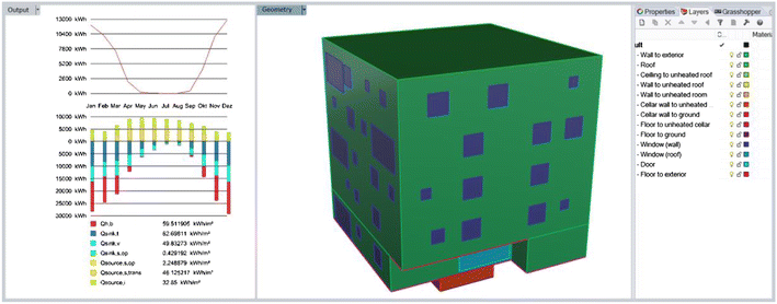 A variety of parametric tools are available for 3D CAD programs: Grasshopper3D (GH) is a parametric tool with a graphical algorithm editor based on Rhinoceros (Rhino). Developed by David Rutten, it was first published in 2007. Since then, a large number of third party plug-ins and links to other software have been developed. For building performance simulation, a connection to EnergyPlus is provided by plug-ins such as Archsim (Dogan 2015), Honeybee (Roudsari et al. 2013) or Diva (Jakubiec and Reinhart 2011). Archsim and TRNSYS-Lizard (Frenzel and Hiller 2014) also provide an interface for TRNSYS. Currently, the only plug-in for a quasi-steady state method is based on ISO 13970 and connects GH to an Excel-based balancing software called Energy Performance Calculator (Ahuja et al. 2015). All these plug-ins export data from the parametric design software for external analysis and then re-import it for visualization. But exporting also introduces a delay and can be the cause of errors. Trials using several of these tools in student design projects showed that the process of exporting and importing acted as a barrier, even when the results are reported a few seconds later (Hollberg et al. 2016). Architects and engineers expect to have instant feedback on their designs, and they ask for a visualization of the results (Attia et al. 2013).