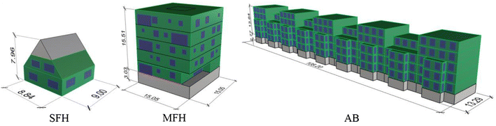The application of the developed tool was verified using three reference buildings, all residential buildings of different types and sizes: a detached single family house (SFH), a multi-family house (MFH) and an apartment block (AB). A study by the Institut Wohnen und Umwelt (Loga et al. 2015) shows that those three categories correspond to the whole range of residential buildings in Germany. Furthermore, their geometric characteristics cover the range of typical building forms.