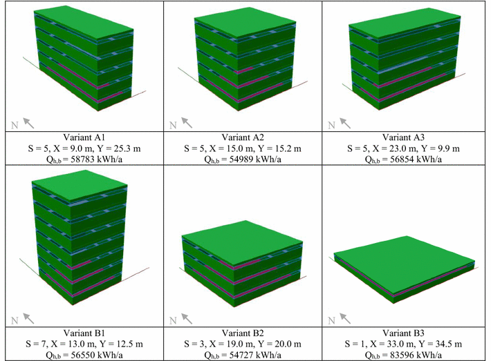 In the second step, the number of storeys was changed for the variant with a square floor plan. Three examples (B1–B3) with the same GFA are shown in Fig. 9. The minimum heating demand is achieved by variant B2 with three storeys. Although the ratio of A/V is bigger than in A2, the heating demand is slightly smaller.