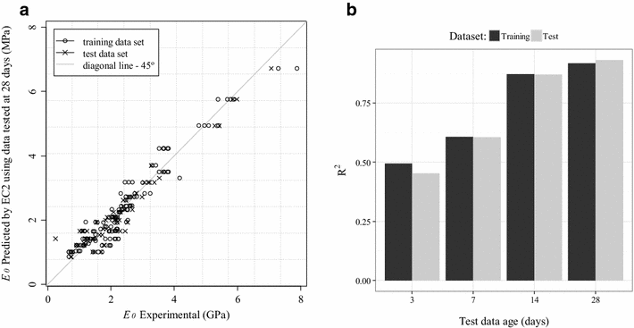 EC2-modified approach adapted to JGLF for E 0 prediction: a scatterplot of E 0 experimental versus predicted by EC2-modified approach using reference data tested at 28 days [4]; b EC2-modified approach performance as a function of the test data age
