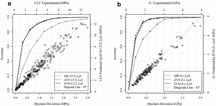 Three different DM algorithms, namely multiple regression (MR), artificial neural network (ANN), and support vector machines (SVM), where applied in the development of predictive models for UCS and E 0 of laboratory soil–cement mixtures [13]. For a detailed description of the parameters adopted for each technique, particularly for ANN and SVM, please see Tinoco et al. [7] and Tinoco et al. [13]. The overall generalization performance of the trained model was assessed using 20 runs under a leave-one-out approach [14], where successively one example is used to test the model and the remaining are used to fit the model [7]. All experiments were conducted in the R tool [15] and supported by rminer library [16].