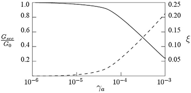 Typical soil variation of stiffness (full) and damping (dashed) with shear strain [25]