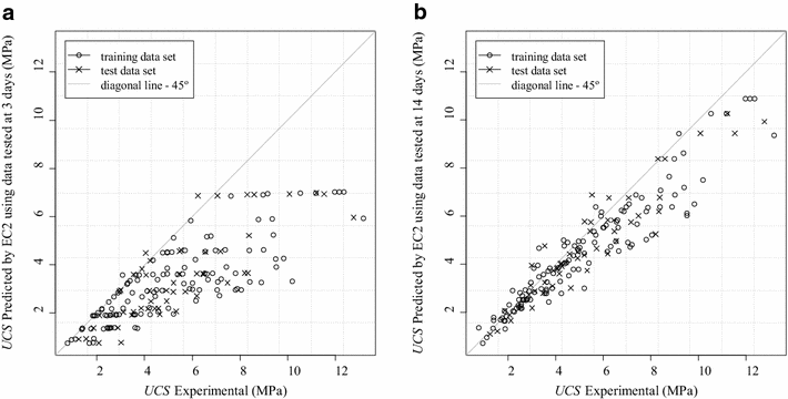 Scatterplot of UCS experimental versus predicted by EC2-modified approach using JGLF [4]: a reference data tested at 3 days; b reference data tested at 14 days