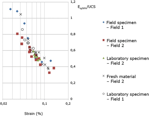 For design purposes, UCS and E tg50% (tangent deformability modulus at 50% of the maximum stress) are those properties currently required. Due to time and cost concerns, usually only compression tests without strain measurement are carried out. Therefore, for E tg50% quantification a relation between E tg50% and UCS (E tg50%/UCS) can be very useful.