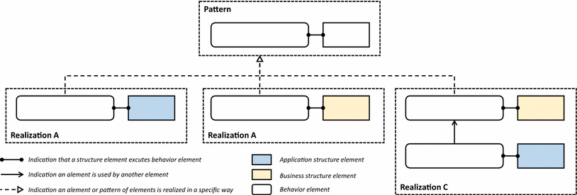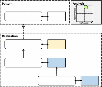Figure 2 shows another example. Again we have a pattern of a behavioural element that is executed by a structure element. In this case the realization is more complex and requires one business structure element and two application structure element, each working in concert to realize the desired pattern. The analysis on the top right indicates that the “realization degree” is fairly high, but the effectiveness of the realization is very high. Such insights can be used in investment decisions. As a side note: the actual realized structure might be ‘discovered’ using techniques from the realm of process mining (see e.g. [24])