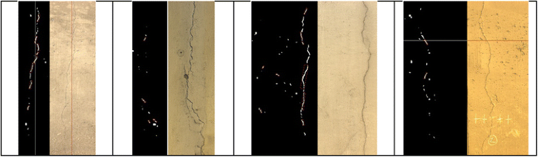 Different results of crack detection using the CNN model. The right part of each column denotes the original image while the left part the detected cracks. However, only the areas within red bounding boxes are considered for the final crack assessment
