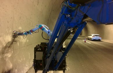 A mobile robotic system of huge arms that is capable of autonomously moving within road tunnels and inspect their structures at huge sizes (up to 7 m). The robotic system consists of the mobile platform and the arm. The latter is necessary so that upon the detection of a crack the robot reaches the crack (though its very small width) and take in situ measurements.
