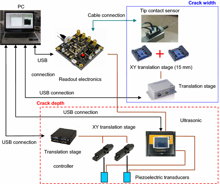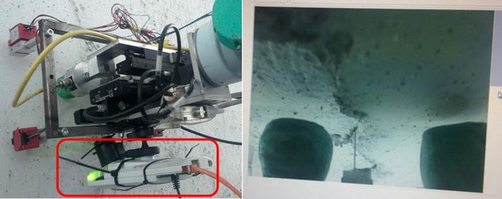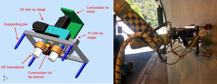 A secondary inspection system (see Sect. 5) that measures (a) the depth of cracks or the depth of the opening of joints of interest with an accuracy of 1 mm and (b) the width of these cracks and openings with an accuracy of 0.1 mm. This accuracy refers to the measurements made by the ultrasound sensor under the assumption that it has been positioned around the crack. Our robotic system exploits computer vision algorithms and 3D SLAM techniques to allow for a precision positioning of the ultrasound sensor around the crack with an accuracy of few centimetres (about 5 cm). The sensors are integrated in the robotic platform on moving arms, in order to be placed on cracks selected for measurement during tunnel inspection. This is performed using the computer vision module which detects cracks and moves the robotic arm in a position near to the crack for installing the ultrasound sensor.